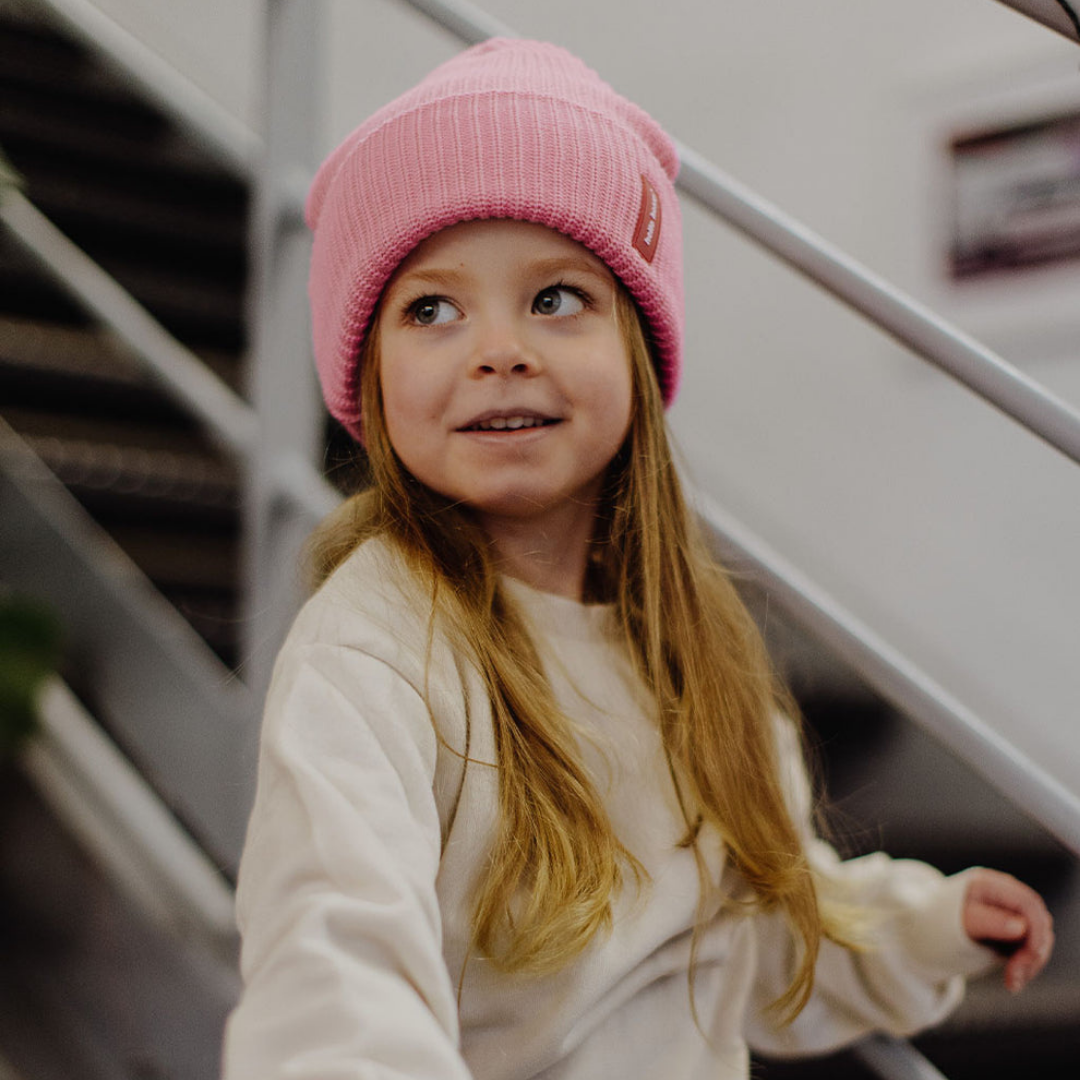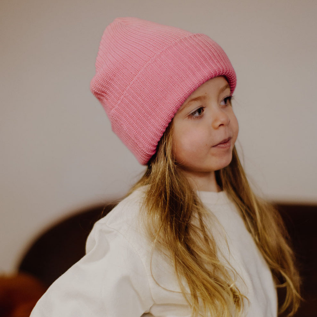 The Hello Hossy Kids Flow Pink Beanie in soft pink is a lightweight, fine-knit hat designed for cooler seasons and everyday wear. With its pompom-free, minimalist design, this OEKO-TEX® certified beanie keeps kids warm and comfortable without overheating.