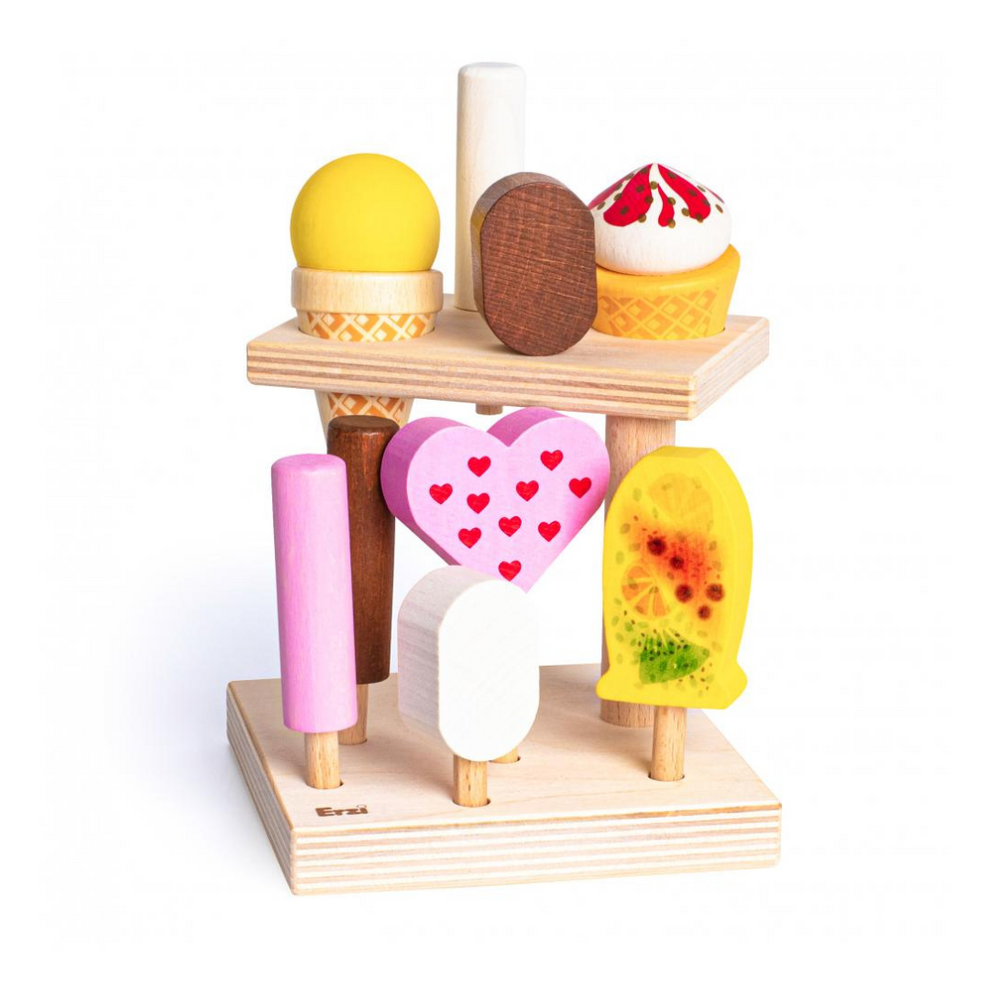 The Set includes 10 wooden pieces: 1 Ice Cream Stand, 1 Chocolate Ice Cream, 1 Vanilla Ice Cream, 3 Milky Sticks, 1 Ice Lolly Fruit , 1 Soft Ice Cream, 1 Ice Lolly Raspberry, 1 Yellow Ice Cream Cone